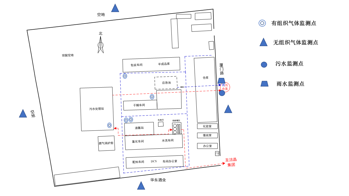 污水總排口一個(gè),位于廠區(qū)東側(cè)外墻外,大氣排放口共5個(gè),其中污水處理1個(gè),氯化2個(gè),干燥1個(gè),包裝1個(gè) |